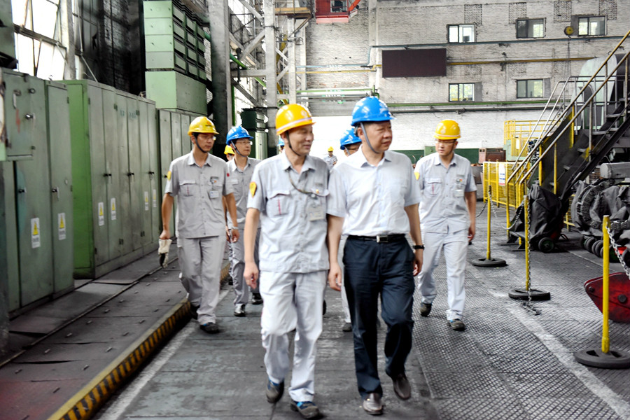 28日,鍛造公司的裝備檢修工作全面鋪開,本已列入計劃檢修項目的120MN萬噸線,為滿足其產品市場的需要而延遲檢修,并開足馬力保生產、保發交、保用戶。在鍛一作業部前梁工區120MN生產現場,楊青一行親眼目睹了120MN萬噸線火熱的生產場景,生產線上流動著一根根通紅的大型曲軸,鍛打、切邊、校正、推拿、翻轉、懸掛,有序流暢。在高溫作業區,各工步上的操作人員神情專注,干勁十足,旁邊的大功率降溫風扇不停地吹著,但汗水依舊浸濕了他們的衣裳。繁忙的生產場面和員工戰高溫的堅強斗志,給楊青一行留下了深刻的印象。針對高溫作業,楊青對隨同的張朝敏說,一定要想辦法改善作業環境,改善作業條件,尤其是要加快裝備自動化推進的步伐,要盡快實現高溫崗位的自動化生產,從裝備上、技術上實現困難作業的革命。